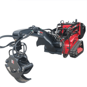The Derette Mini Skid Steer model 450T is shown with the Hydraulic Rotating Grapple. This is a versatile piece of equipment suitable for a wide range of operating environments. This attachment is designed for gripping, lifting and placing various types of objects, especially where precise control and rotating functions are required.
